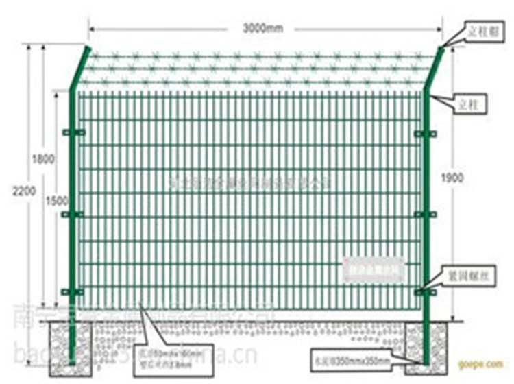 特點:雙邊絲護欄網**大的特點就是安裝便捷,不受場地高低起伏的影響,其結構簡單,安裝時只要把柱子固定好,再用配件將網片連接就安裝完成。再者就是雙邊絲護欄網較其他護欄網用料少,價格便宜。雙邊絲護欄網表面經過浸塑,防腐蝕效果好,使用壽命延長。在雙邊絲網片上加上合適的折彎就會改善其雙邊絲剛度不足的弱點,增強了防護性能。