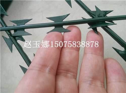 刀刺隔離網墻工藝:它采用鋼板(刀板)沖壓成型包附于熱鍍鋅鋼絲(芯線)之上,由銳利尖角鍍鋅鋼板或不銹鋼薄板做刀片,高張力鋼絲做芯線組合而成的。