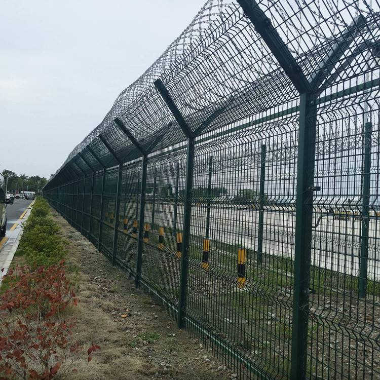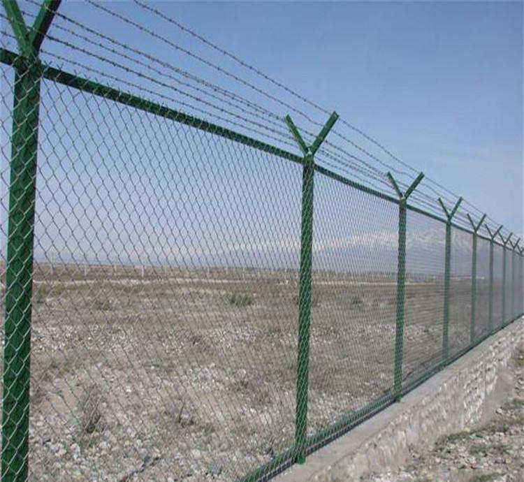 機場護欄網又稱作“Y型安全防御護網”,由Y型支架立拄,加強型焊接網,安全防盜連接件和熱鍍鋅刀片刺網組成,是強度和安全防御性級別很高的圍界護欄網產品。采用5.0mm高強度低碳鋼絲焊接,網孔:50mmX100mm,50mmX200mm網片中帶有V型加強筋,可大大增強圍網的抗沖擊力,立柱為60X60的矩形鋼,頂端焊有V型之架,或者采用70mmX100mm的掛式。注:如果在機場護欄網頂部加裝刀片刺絲、刀片刺繩后又很好的增強了安全防護性能。